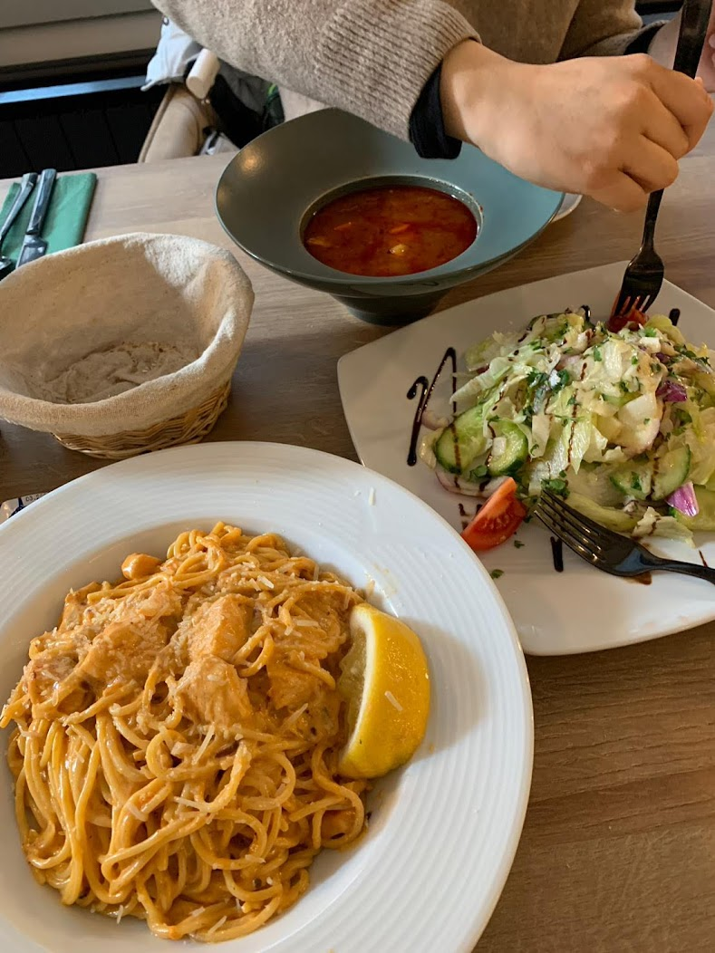 我們點了匈牙利牛肉湯、沙拉和鮭魚義大利麵;沙拉上桌後,我們像瘋了一樣爆吃 XDD (彌補前幾天被麵包支配的恐懼);牛肉湯原本擔心會過鹹,但實際上味道正合適,很符合台灣人的口味,難怪台灣人這麼愛布達佩斯的食物。
